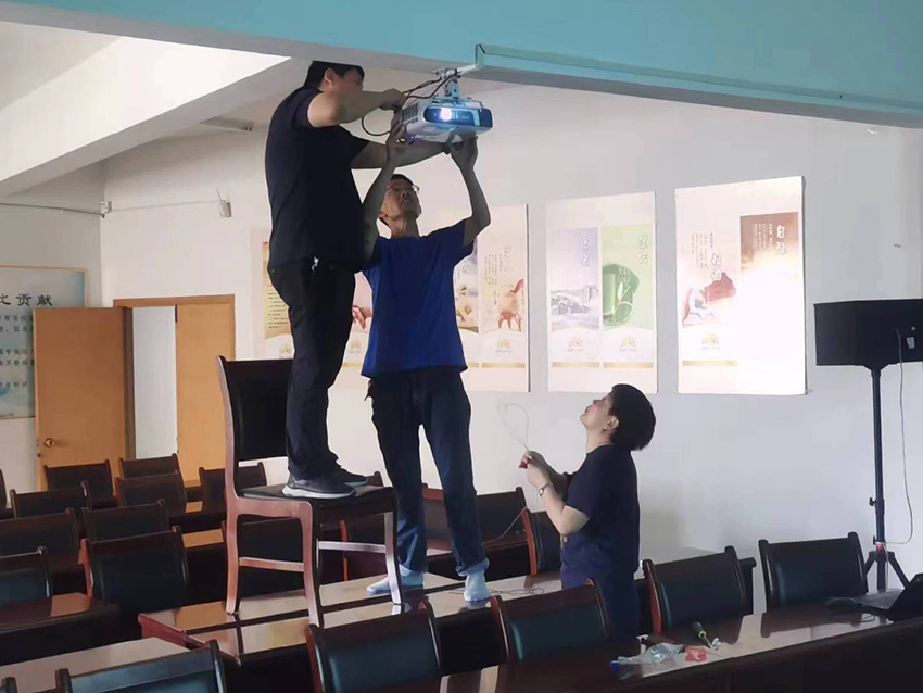 7月11日,李楊猛和譚國紅兩位同志協助信息部一起動手安裝、調試新購投影儀。